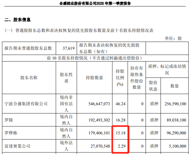 截至2025年第一季度末,合盛硅業(yè)第三、第四大股東的持股比例分別為15.18%、2.29%。