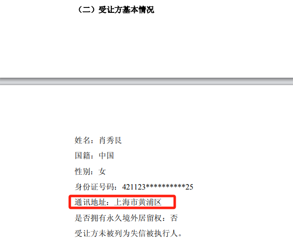 同時,肖秀艮作為自然人股東實力不凡。公告顯示,肖秀艮為女性,通訊地址在上海市黃浦區(qū)。