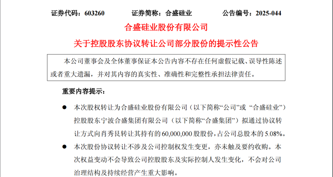 合盛硅業(yè)公告稱,本次協(xié)議轉讓不會使公司控制權發(fā)生改變,轉讓雙方不存在關聯(lián)關系。