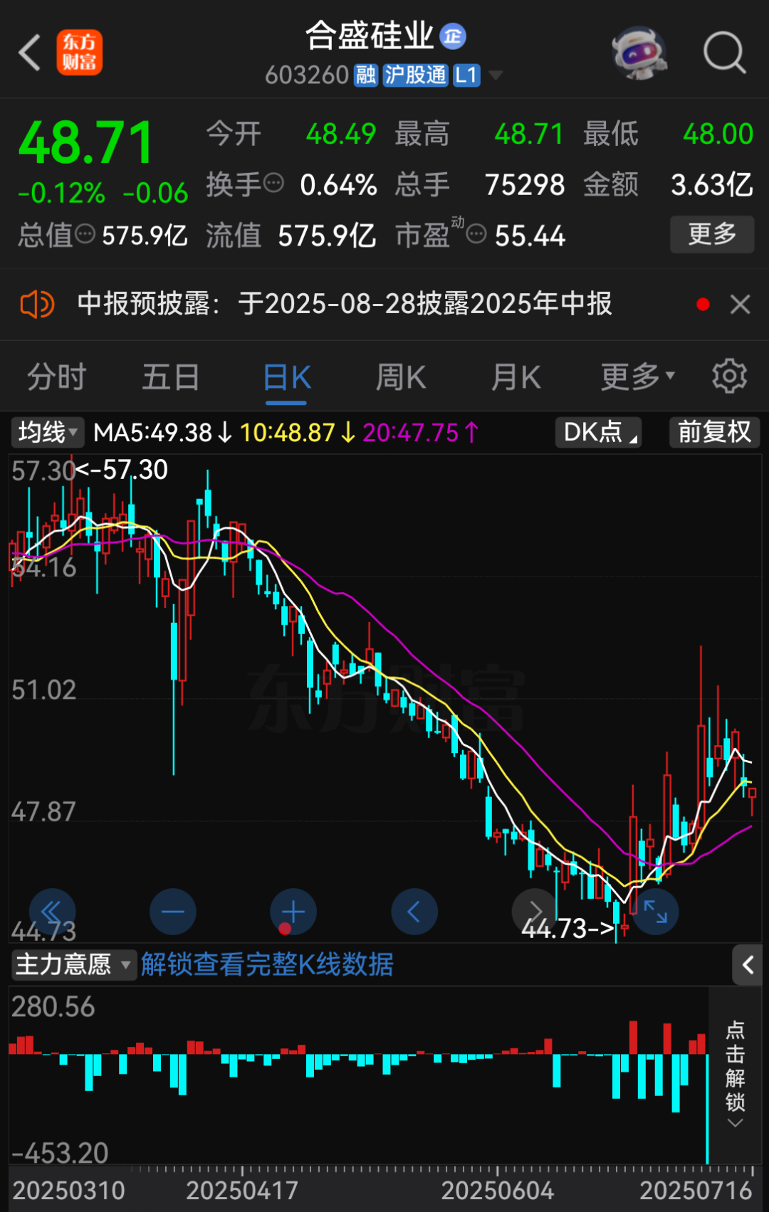 截至7月16日收盤,合盛硅業(yè)股價為48.71元/股,總市值達575.9億元。