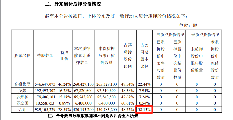 實施質押后,合盛集團及其一致行動人羅立國、羅燚、羅燁棟累計質押合盛硅業(yè)股份數量達4.51億股,占其所持合盛硅業(yè)股份總數的48.52%,占合盛硅業(yè)總股本的38.13%。