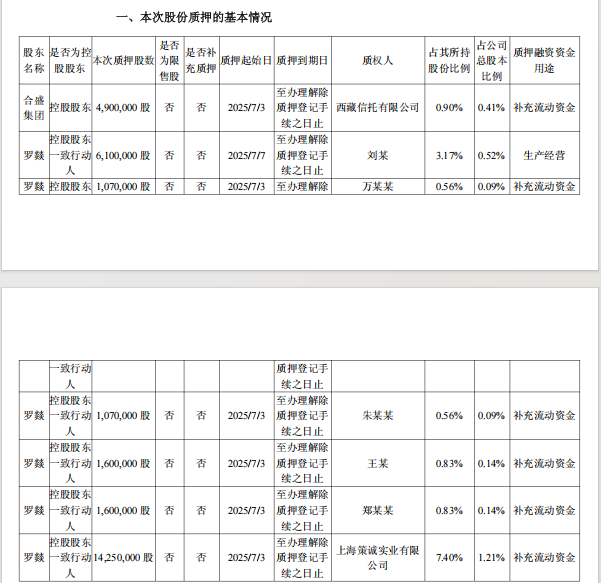 近期,合盛集團多次發(fā)出缺錢信號。7月3日,合盛集團及其一致行動人羅燚多次質押所持合盛硅業(yè)股份,所獲資金用于補充流動資金和生產經營。
