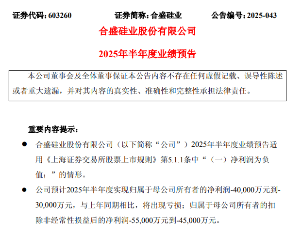 而且合盛硅業(yè)近期業(yè)績不佳。7月15日,合盛硅業(yè)公告稱,預計公司2025年上半年歸母凈利潤為 -4億元至 -3億元,同比由盈轉虧;扣非后凈利潤為 -5.5億元至 -4.5億元,同比也由盈轉虧。