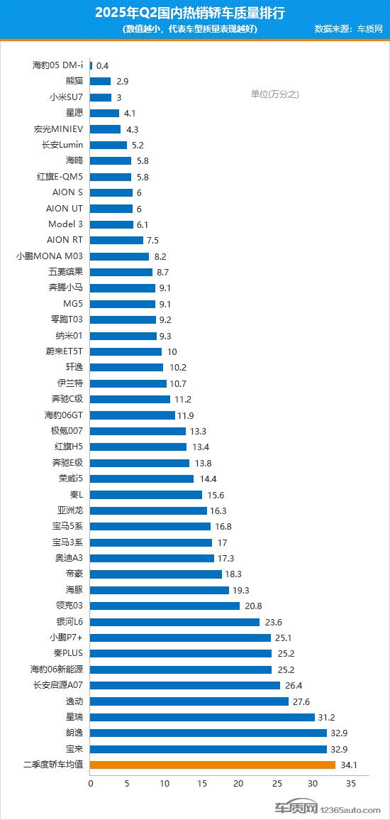 2025年二季度國內(nèi)熱銷轎車質(zhì)量排行情況