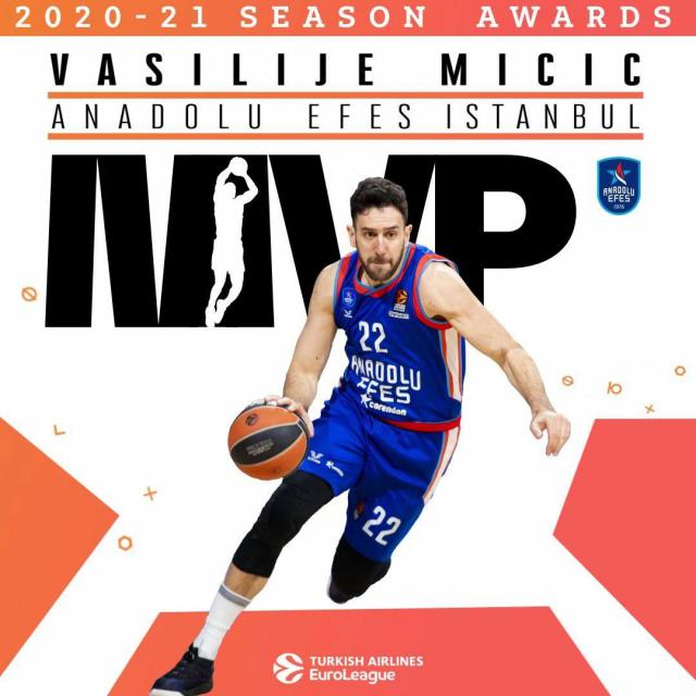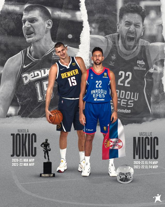 2021 - 22賽季,約基奇在NBA蟬聯(lián)常規(guī)賽MVP,米西奇在歐洲賽場(chǎng)也實(shí)現(xiàn)了大滿貫。他單賽季包攬了土耳其聯(lián)賽、土耳其國(guó)家杯賽和歐洲聯(lián)賽的冠軍,場(chǎng)均砍下18.2分、2.7個(gè)籃板、4.6次助攻,還蟬聯(lián)了歐洲聯(lián)賽四強(qiáng)賽的MVP。