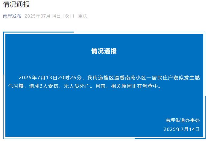 據(jù)重慶南坪街道辦事處通報(bào),2025年7月13日20時(shí)26分,南坪溫馨南苑小區(qū)一居民住戶(hù)疑似發(fā)生燃?xì)忾W爆,造成3人受傷。目前,相關(guān)原因正在調(diào)查中。