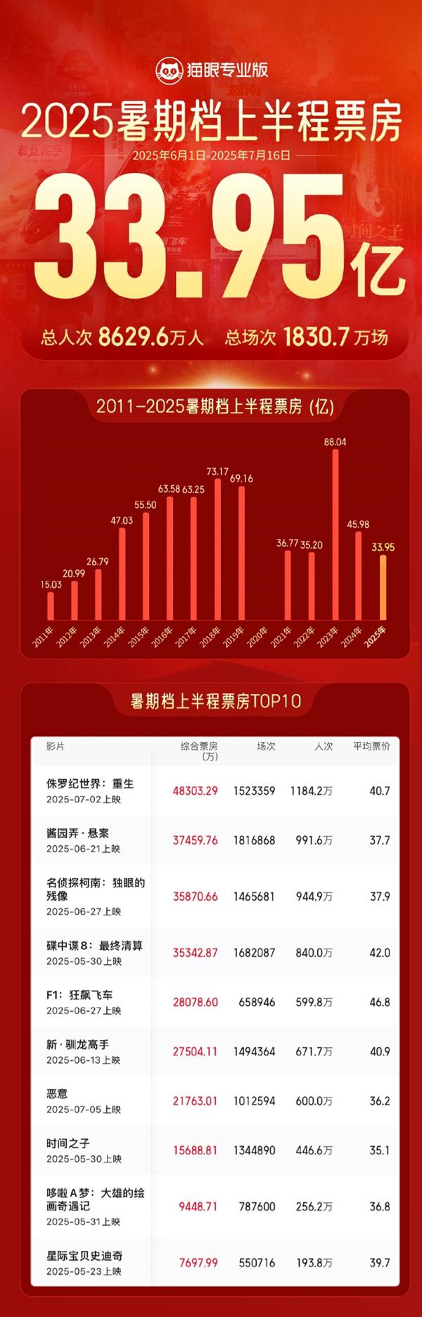 2025暑期檔上半程票房33.95億,前十7部為進口片