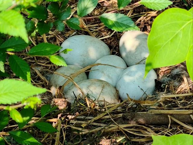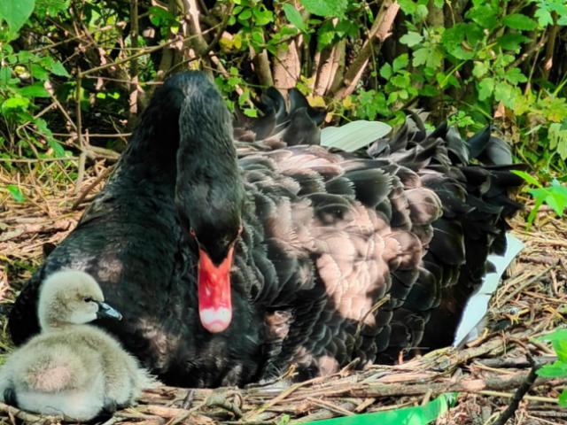 在4月中下旬,這對黑天鵝選定了火烈鳥館后的小島,在果樹下用細枝和羽毛精心筑巢。4月20日,它們產(chǎn)下第一枚卵,隨后的九天里,一共孕育了6枚卵。之后便開啟了為期36天的孵化期,黑天鵝夫婦輪流守護著這些卵。公園的保育員在發(fā)現(xiàn)黑天鵝孵化后,及時增設了投喂點,以保障它們的營養(yǎng)需求,還定期巡查并記錄它們的行為。