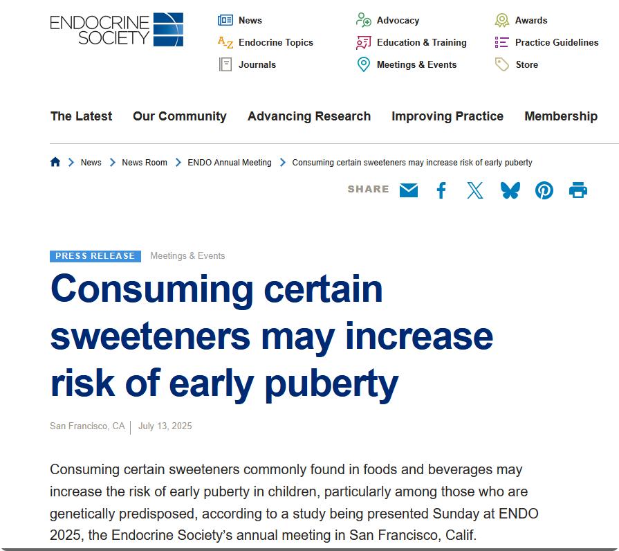 7月13日,美國(guó)舊金山舉行的內(nèi)分泌學(xué)會(huì)年會(huì)(ENDO 2025)公布的研究顯示,食品飲料中常見的阿斯巴甜、三氯蔗糖、甘草甜素等甜味劑,可能增加兒童性早熟風(fēng)險(xiǎn)。