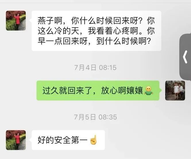 山上的信號(hào)時(shí)有時(shí)沒有,在6600米左右的一個(gè)雪坡上休息時(shí),突然她的手機(jī)收到一條信息,來自她的嬢嬢。嬢嬢在微信里說:“燕子,這么冷的天,我看著你心疼,早一點(diǎn)回來?!蹦且豢?,來自親人的溫暖驅(qū)散了雪山的寒冷。