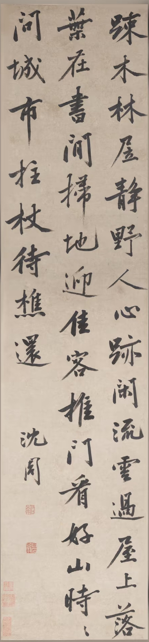 沈周《行書(shū)五律詩(shī)軸》:疏木林居靜,野人心跡閑。流云過(guò)屋上,落葉在書(shū)間。掃地迎佳客,推門(mén)看好山。時(shí)時(shí)問(wèn)城市,拄杖待樵還。 蘇州博物館藏