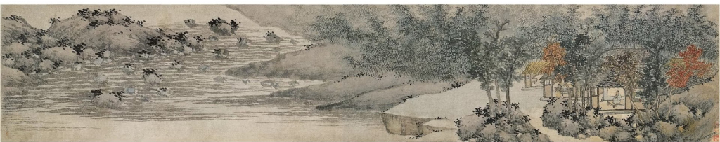 蘇州博物館收藏的《岸波圖卷》,是他精神世界的絕佳寫(xiě)照。畫(huà)卷展開(kāi),水波用粗放抖動(dòng)的長(zhǎng)線勾勒,山石在起伏間若隱若現(xiàn)。濃墨點(diǎn)苔讓坡石充滿生機(jī),蜿蜒的水岸引向竹林高樹(shù)。墨色濃淡交織,營(yíng)造出層層疊疊、影影綽綽的深邃空間。幾簇紅葉如點(diǎn)睛之筆,將視線引向掩映其中的草堂。