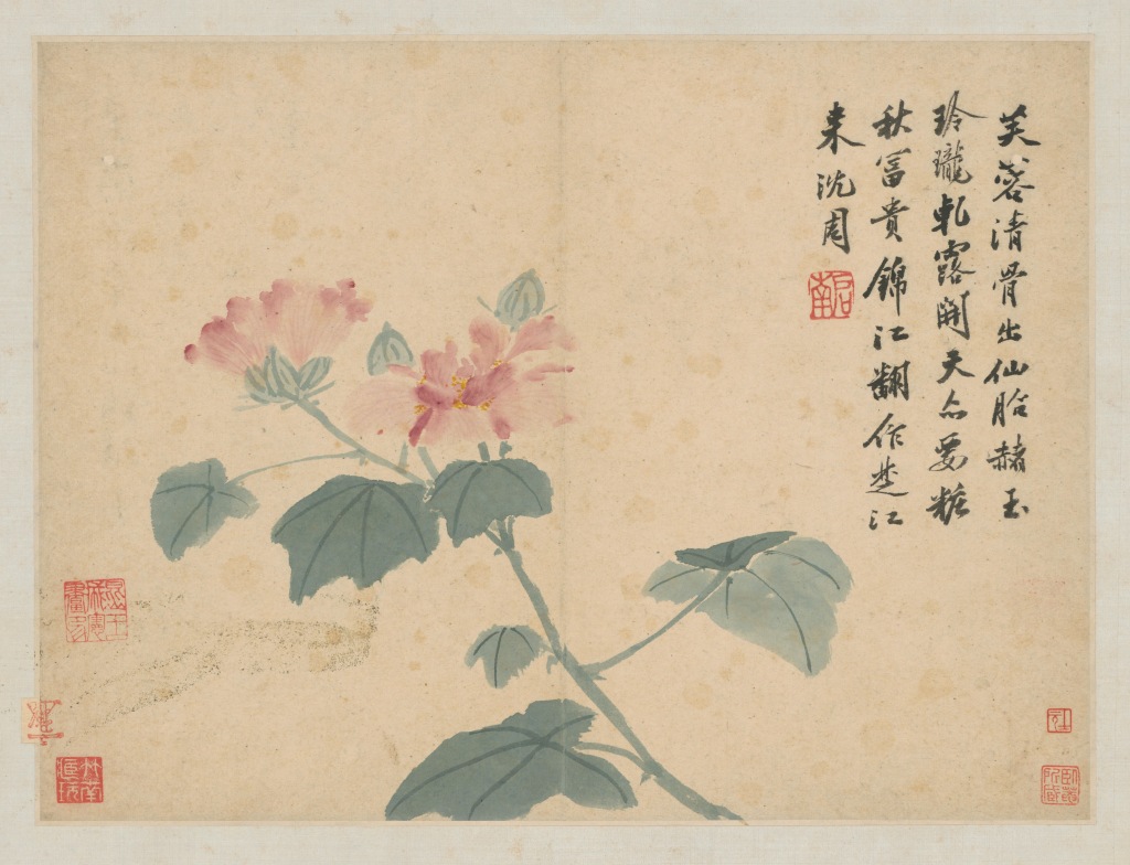 《秋山讀書(shū)》圖堪稱他的精神自畫(huà)像:秋意濃濃的坡石上,一位青衣高士手持書(shū)卷獨(dú)坐,低頭沉思。左上角自題詩(shī)云:“高木西風(fēng)落葉時(shí),一襟蕭爽坐遲遲。閑披秋水未終卷,心與天游誰(shuí)得知。”此“心與天游”,正是臥游的真諦——讓山水住進(jìn)心里。臺(tái)北故宮博物院收藏的《秋葵》與《寫(xiě)意冊(cè)》之芙蓉,也是這種臥游精神的延伸,以簡(jiǎn)潔的筆觸捕捉草木神韻,在案頭展現(xiàn)天地生機(jī)。