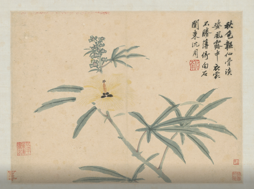 沈周的精神園林也在現(xiàn)實(shí)中生根。沈家主宅西莊內(nèi)有個(gè)小軒叫秋軒,里面“雜植芙蓉、黃葵、甘菊”。他平日為所開(kāi)之花寫(xiě)生,“鮮榮發(fā)而涼風(fēng)至,夕陽(yáng)滿地,錯(cuò)采可愛(ài)”。作為軒中之人,他常感覺(jué)“聽(tīng)茫茫,視荒荒,多怠而健忘”。秋軒是他祖父所建,沈周寫(xiě)《秋軒記》時(shí)已步入人生暮年。他和父親沈恒一樣恬淡,不喜俗務(wù)與浮名,在庭院里除草、翻土、種花,“養(yǎng)其衰、徯其老、全其生于斯也”。他畫(huà)筆下的芙蓉、黃葵顏色清雅、造型舒朗,頗具稚拙之趣。