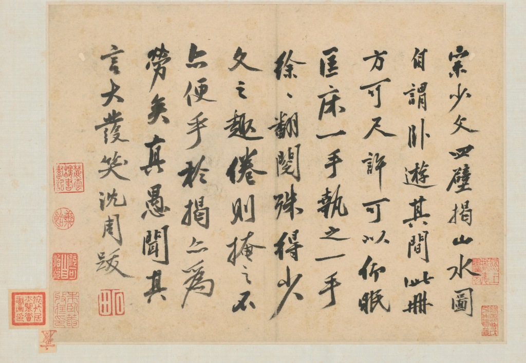 他在畫(huà)冊(cè)題跋中寫(xiě)道:“宗少文(宗炳)四壁揭山水圖,自謂臥游其間。此冊(cè)方可尺許,可以仰眠匡床,一手執(zhí)之,一手徐徐翻閱,亦得少文之趣。”