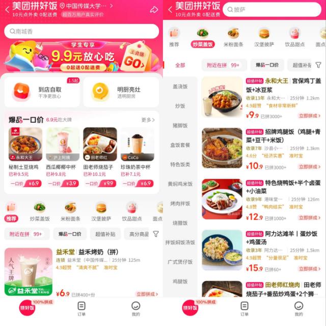 拼好飯頁面的核心品類主要是炒菜、蓋飯、米粉面條等正餐,能滿足消費(fèi)者一日三餐的需求。