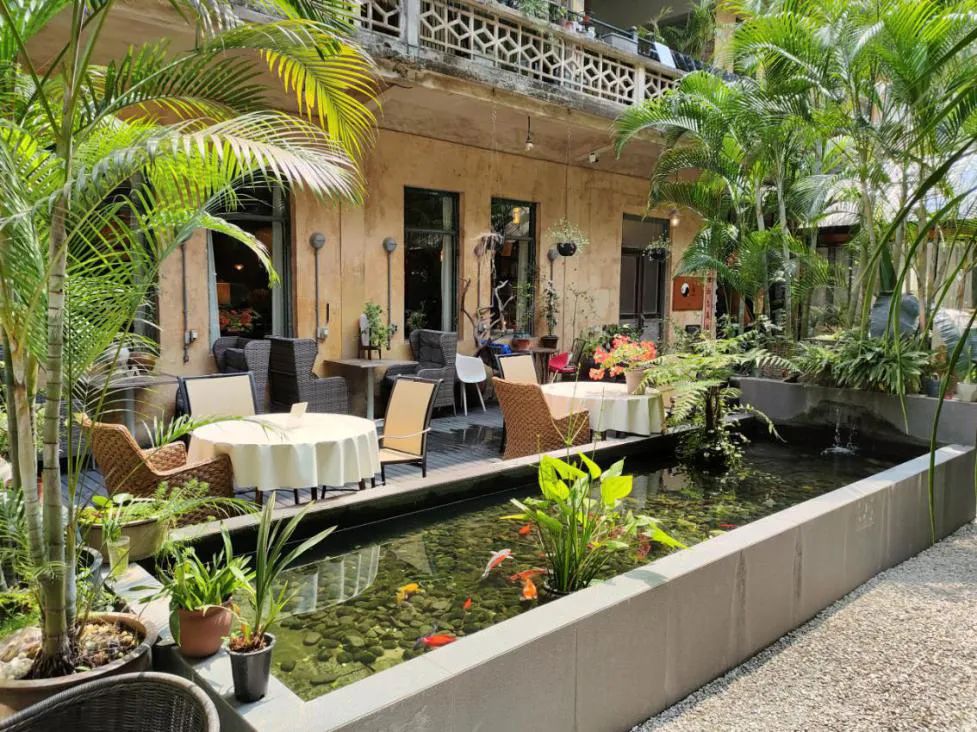 這是老舊建筑內(nèi)的庭院,面積約300平方米,院內(nèi)綠植繁茂,以高大的棕櫚樹和各種低矮的綠色熱帶植物為主。復(fù)古的家具裝飾,波光粼粼的魚池,每一處細(xì)節(jié)都盡顯精致,小庭院成為了“方寸空間”里的“心靈棲息地”。