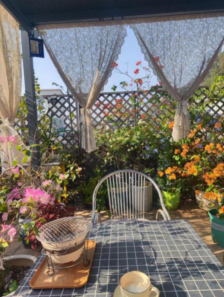 庭院面積雖不大,但綠植豐富。種植了20多棵竹子和30多種花卉,如百合、雪藍(lán)花、向日葵、鳳仙、初吻花等。院子中央擺放著一套精致的野餐桌椅,仿佛是為戶外聚會打造的溫馨角落。微風(fēng)拂過,花香撲鼻。