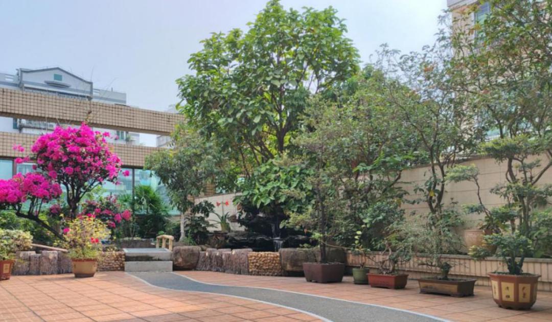 庭院地面鋪設(shè)棕紅瓷磚,四周磚墻環(huán)繞,種有多種喬木、灌木,搭配三角梅、造型盆景等綠植。庭院中央設(shè)有水景,小橋橫跨,假山流水潺潺,動靜相宜,宛如一個充滿詩意的小天地。