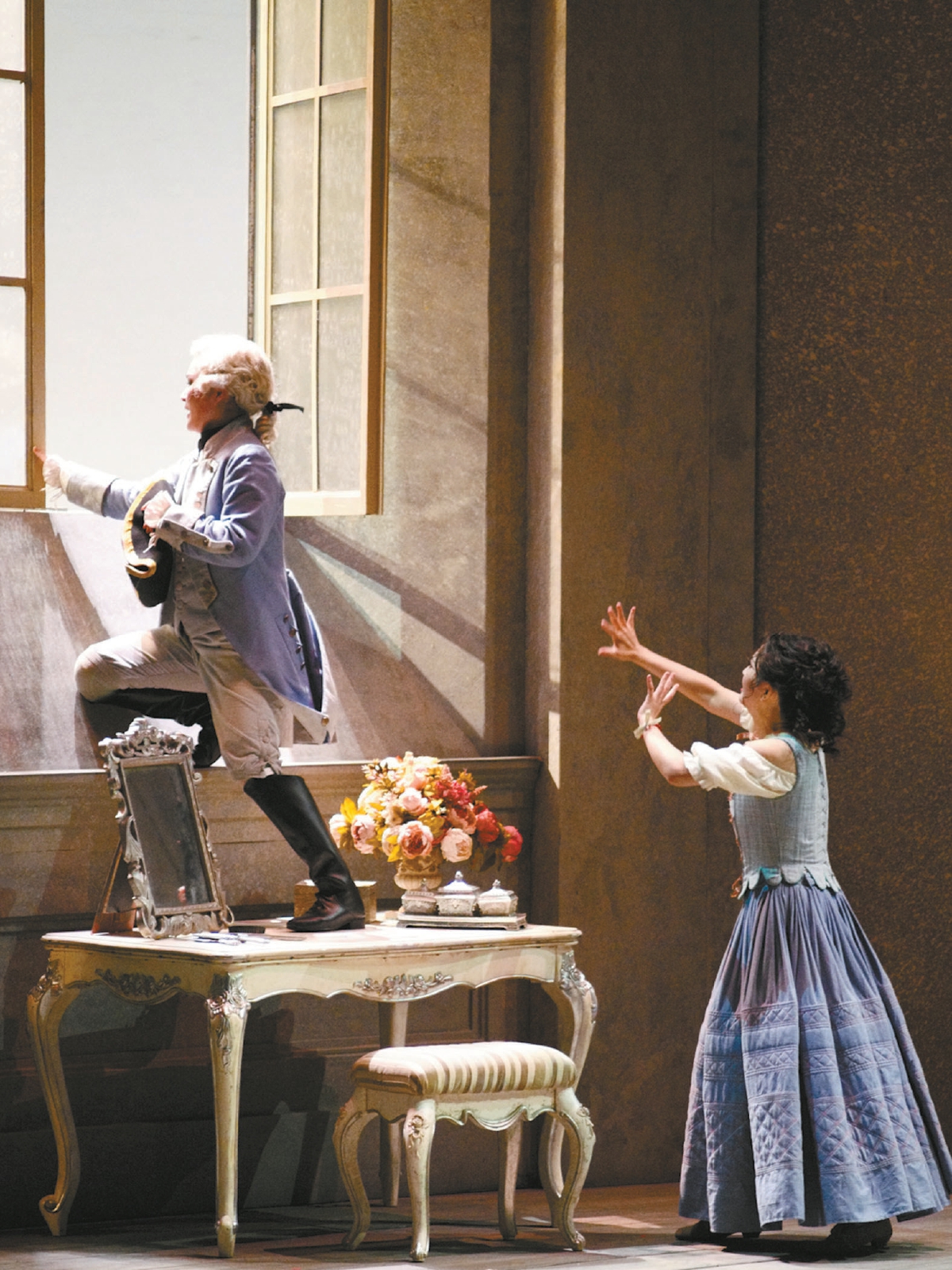 奧地利男中音馬庫(kù)斯·維爾巴飾演的費(fèi)加羅一登場(chǎng)便贏得滿堂喝彩。他用渾厚圓潤(rùn)的音色與精湛的表演技巧,把這位機(jī)智勇敢的男仆形象刻畫得入木三分。在詠嘆調(diào)“如果你想跳舞”中,維爾巴與國(guó)家大劇院合唱團(tuán)默契配合,將劇情推向首個(gè)高潮,合唱團(tuán)飽滿和諧的和聲為音樂增添了絢麗色彩。第一幕結(jié)尾處,維爾巴演唱的著名詠嘆調(diào)“再不要去做情郎”,以明快有力的旋律與溫柔勸導(dǎo)的宣敘調(diào)交替呈現(xiàn),生動(dòng)展現(xiàn)了費(fèi)加羅幽默風(fēng)趣與堅(jiān)定勇敢的雙重性格,鏗鏘有力的演唱贏得全場(chǎng)掌聲雷動(dòng)。