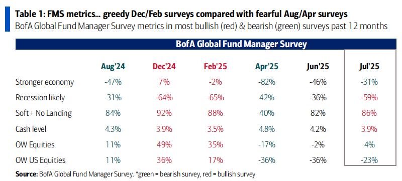 Hartnett特別指出,基金經(jīng)理調(diào)查已成為一個(gè)“極佳的反向指標(biāo)”, 標(biāo)記了過去一年的關(guān)鍵轉(zhuǎn)折點(diǎn)——例如在市場(chǎng)底部時(shí)(如2024年8月)顯示悲觀,而在市場(chǎng)頂部時(shí)(如2025年2月)顯示樂觀。