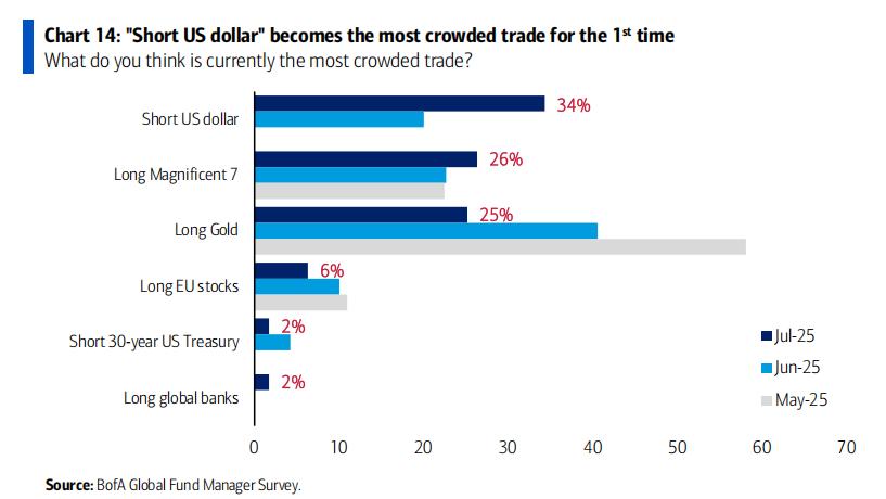 調(diào)查還揭示了當(dāng)前市場(chǎng)最為擁擠的交易策略。做空美元位居首位,占比34%,做多“七巨頭”科技股占比26%,做多黃金交易占比25%,做多歐盟股票的比例為6%。