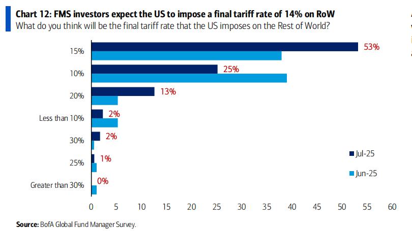 投資者預(yù)期,美國(guó)對(duì)貿(mào)易伙伴征收的最終關(guān)稅稅率為14%,較6月份的13%預(yù)期有所上升,顯示市場(chǎng)對(duì)貿(mào)易政策走向仍保持密切關(guān)注。