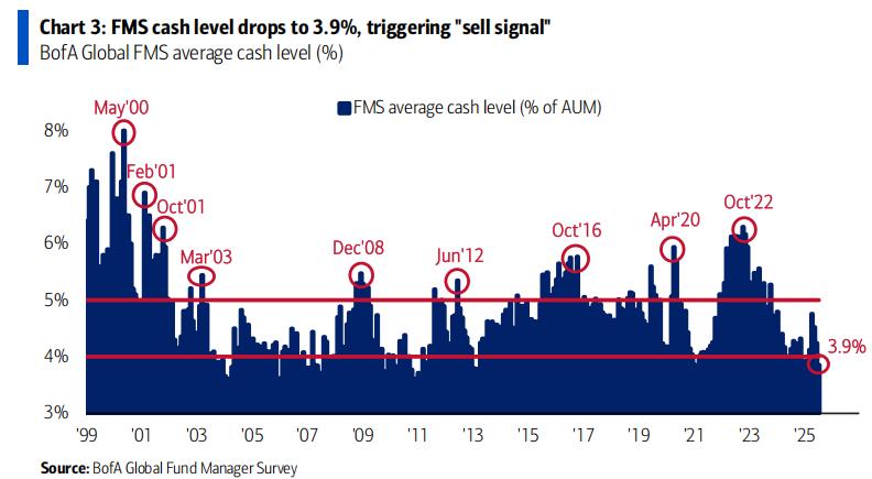(基金經(jīng)理持有的平均現(xiàn)金水平在7月降至3.9%,而6月為4.2%,這觸發(fā)了“賣出”信號(hào))