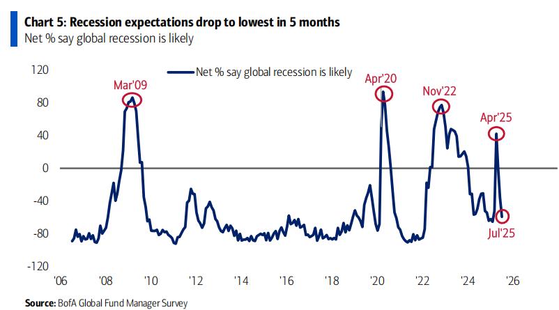 投資者情緒出現(xiàn)顯著轉(zhuǎn)變,凈59%的參與者認(rèn)為未來一年發(fā)生經(jīng)濟(jì)衰退的可能性較低。這與4月1日后的市場(chǎng)情緒形成鮮明對(duì)比,當(dāng)時(shí)衰退擔(dān)憂情緒濃厚。