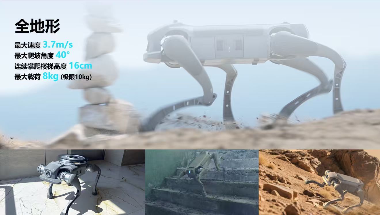 - 全地形適應(yīng):采用AI強(qiáng)化學(xué)習(xí)運(yùn)控算法,搭載強(qiáng)勁動力系統(tǒng),可在山路、廢墟、沙地等復(fù)雜地形中實現(xiàn)智能決策,最高運(yùn)動速度3.7米/秒,最大爬坡角度40°,連續(xù)攀爬樓梯高度16cm,最大載荷8kg,輕松應(yīng)對真實場景挑戰(zhàn)。