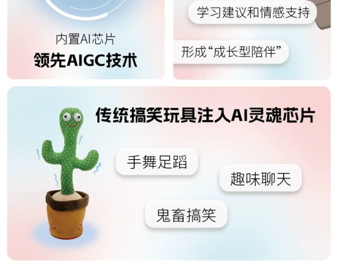 兒童向AI玩具形態(tài)更多元。有的是能掛在毛絨玩具上的智能盒子,讓“阿貝貝”活起來;有的是內(nèi)置大模型的玩偶,如Folotoy的“仙人掌”,對話時扭動身體很喜感,受孩子和家長喜愛。