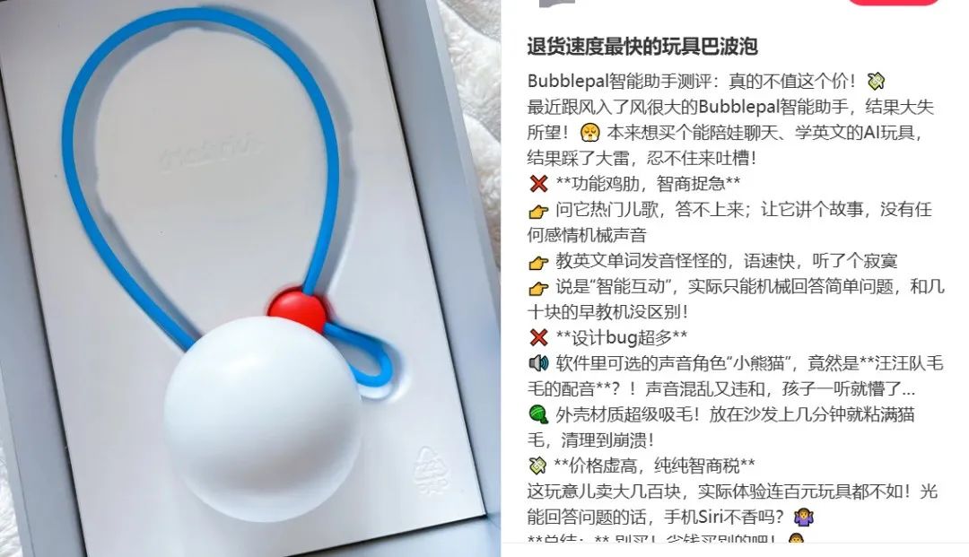 一位買過Bubblepal智能掛件的寶媽說,種草時說“智能互動”,買回來只能機械回答簡單問題,和幾十塊的早教機差不多。