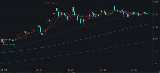 5月初和6月中旬,金價兩次接近3460美元,但都未能進一步突破。截至今日發(fā)稿,國際金價在3340美元附近窄幅震蕩。