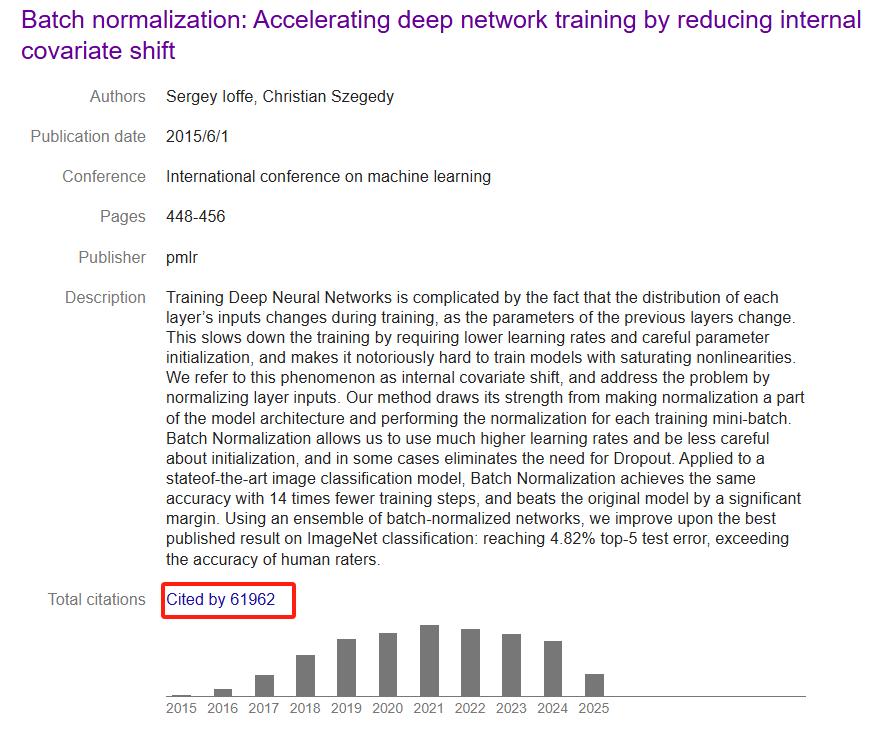 自2015年由谷歌研究員Sergey Ioffe和Christian Szegedy提出以來,這篇論文的引用量已超過六萬次,是其所在時(shí)代被引用次數(shù)最多的深度學(xué)習(xí)文獻(xiàn)之一。