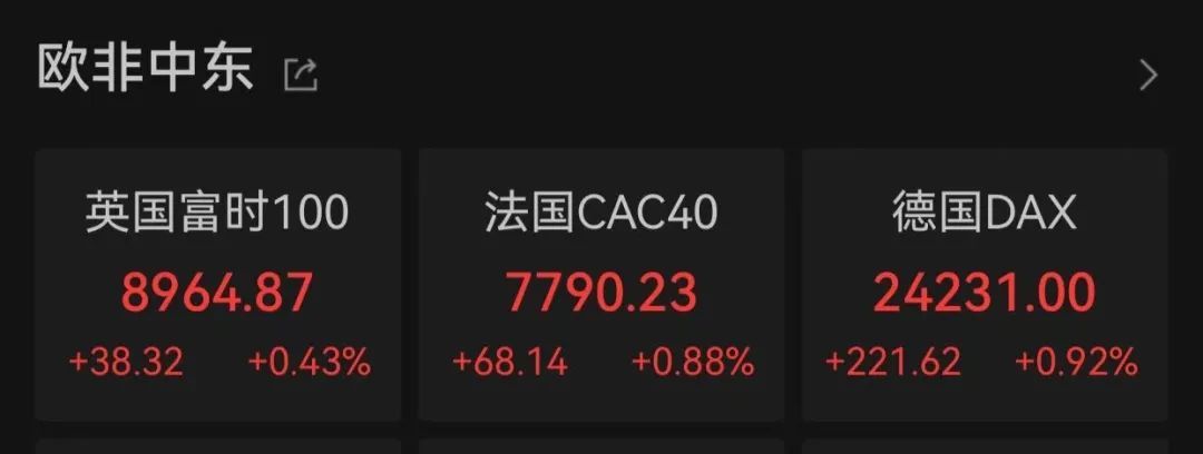 市場(chǎng)方面,今日亞太市場(chǎng)股市多數(shù)上漲,已開(kāi)盤(pán)的歐洲市場(chǎng)也集體拉升,英法德三國(guó)重要股指均飄紅,德國(guó)DAX指數(shù)漲幅超0.9%,法國(guó)CAC40指數(shù)漲幅近0.9%。