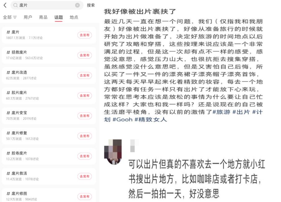 當(dāng)“出片”成為標(biāo)配,“反出片”亞文化興起。小紅書“#廢片”話題瀏覽量達(dá)1806.9萬次,7.1萬人參與討論,部分年輕人抵制過度擺拍,追求真實(shí)記錄。