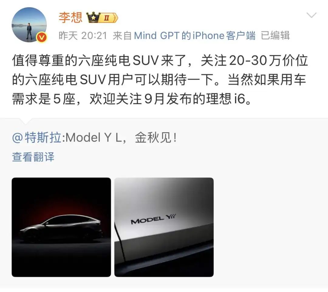 有網(wǎng)友猜測(cè)特斯拉提前公布Model Y L消息,是為了鎖定即將上市的理想i8潛在用戶。理想汽車CEO李想7月16日轉(zhuǎn)發(fā)特斯拉微博稱,“值得尊重的六座純電SUV來了,關(guān)注20 - 30萬價(jià)位的六座純電SUV用戶可以期待一下。當(dāng)然如果用車需求是5座,歡迎關(guān)注9月發(fā)布的理想i6?!睂odel Y L繞開了理想i8價(jià)格區(qū)間。