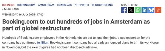 據(jù)荷蘭媒體最新消息,全球最大OTA Booking.com將在全球范圍內裁員約1000人,其中包括總部荷蘭的一些崗位。