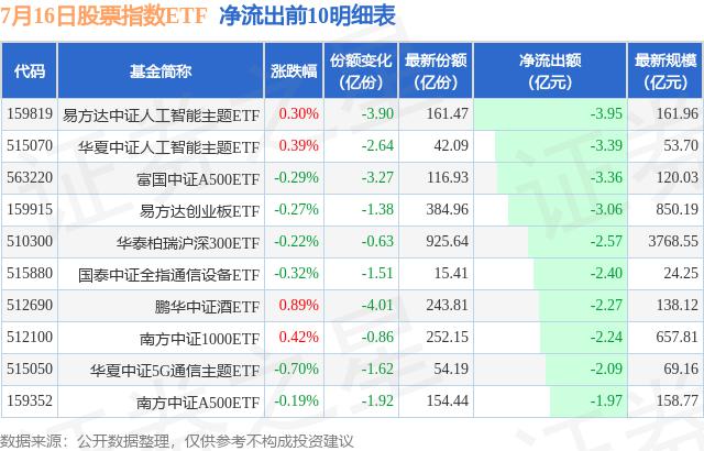 當(dāng)日有360只股票指數(shù)ETF基金出現(xiàn)資金凈流出,其中凈流出排首位的是易方達(dá)中證人工智能主題ETF(159819),份額減少了3.9億份,凈流出額為3.95億元。