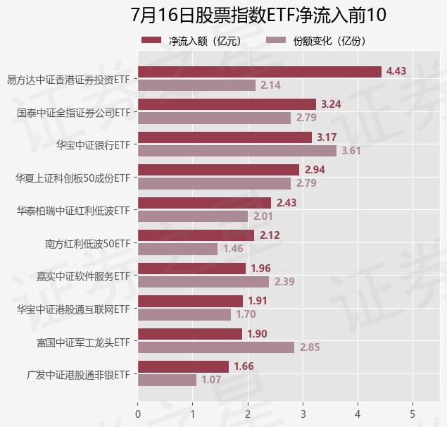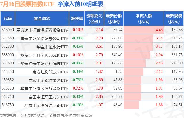 當(dāng)日有215只股票指數(shù)ETF基金出現(xiàn)資金凈流入,其中凈流入排首位的是易方達(dá)中證香港證券投資ETF(513090),份額增加了2.14億份,凈流入額為4.43億元。