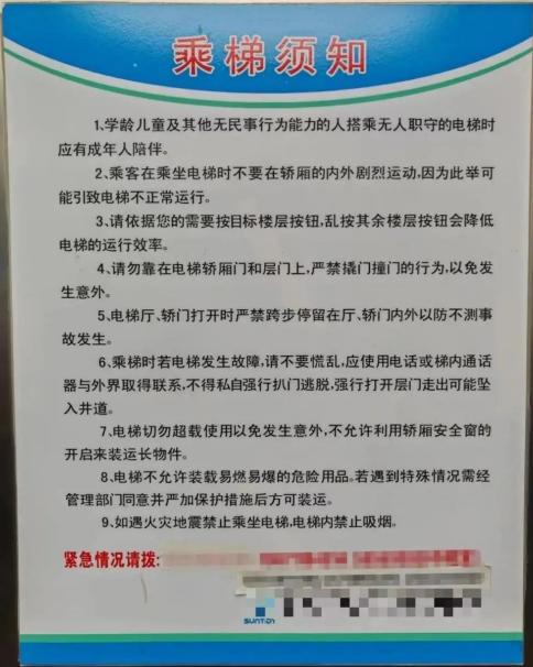 (一)使用登記標(biāo)志、檢驗(yàn)標(biāo)志。依據(jù)《特種設(shè)備使用管理規(guī)則》(TSG 08 - 2017)3.11,特種設(shè)備(車用氣瓶除外)使用登記標(biāo)志與定期檢驗(yàn)標(biāo)志合二為一,統(tǒng)一為《特種設(shè)備使用標(biāo)志》。該標(biāo)志主要反映電梯檢驗(yàn)、登記、應(yīng)急等信息,包括使用管理主體、登記機(jī)關(guān)、檢驗(yàn)有效期、維保(救援)單位和應(yīng)急救援電話等,方便乘梯人了解電梯基本情況,也便于公眾監(jiān)督。