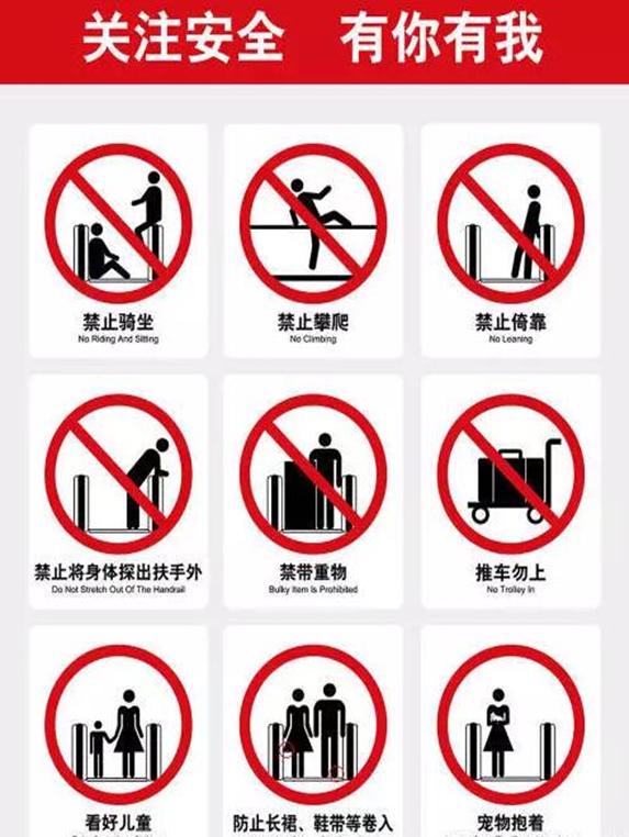 (二)警示標(biāo)志、安全注意事項(xiàng)。為確保電梯安全運(yùn)行,在發(fā)生故障時(shí)能快速施救,電梯應(yīng)將警示標(biāo)志和安全注意事項(xiàng)置于乘客容易注意的顯著位置。