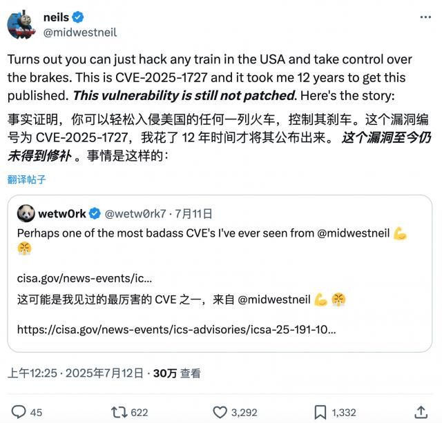 既然沒修好,為啥先公開詳情呢?原來,這個(gè)問題在美鐵路系統(tǒng)已潛伏幾十年,發(fā)現(xiàn)它的安全研究員Neil Smith為讓漏洞修復(fù),和鐵路巨頭博弈了12年。公開漏洞,施加壓力,是他最后的辦法。