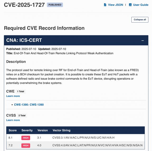 2016年,Neil Smith在《波士頓評論》發(fā)文揭露AAR內(nèi)幕,AAR馬上在《財(cái)富》上反駁,稱是不實(shí)指控。這讓Neil Smith心力交瘁,暫時(shí)放棄了。2024年,ICS - CERT重組為CISA,Neil Smith再次提交漏洞表單,但AAR依舊頑固,還稱設(shè)備和協(xié)議快到期,沒必要修復(fù)。多次溝通無果后,CISA同意Neil Smith公開漏洞的請求。這在安全領(lǐng)域是最后手段,利用輿論壓力迫使廠商行動(dòng)。最終,漏洞在發(fā)現(xiàn)13年后獲得官方編號CVE - 2025 - 1727,AAR也宣布采用新的安全標(biāo)準(zhǔn)取代舊系統(tǒng),但更換最快要到2027年。這期間,美國貨運(yùn)鐵路就像在賭博,賭在黑客動(dòng)手前能完成更新。最后,Neil Smith警告大家不要嘗試操控火車,以免害死人。