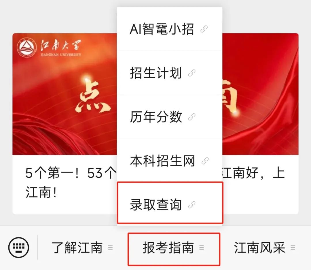 考生和家長可進(jìn)入“江南大學(xué)本科招生”微信公眾號,點擊菜單欄的“錄取查詢”,實時查詢錄取結(jié)果。