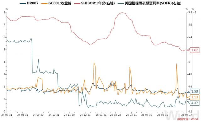 資金面整體平衡,存款類機(jī)構(gòu)隔夜質(zhì)押式回購利率小幅下行,處于1.46%;七天質(zhì)押式回購利率下行不足1個(gè)bp,位于1.52%。海外方面,美國最新隔夜融資擔(dān)保利率為4.37%。