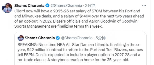 利拉德在2025 - 26賽季憑借在波特蘭和密爾沃基的合同,薪資將達(dá)7000萬美元;在2027年選擇跳出合同前,未來兩年薪資總額為1.41億美元。在決定重返開拓者前,利拉德收到了多份來自其他球隊的中產(chǎn)和底薪報價。