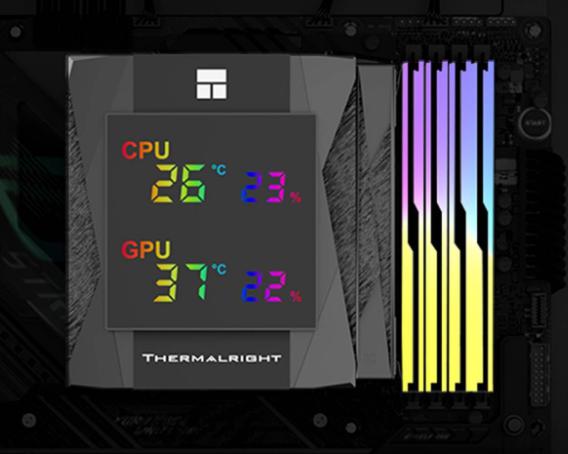 此系列散熱器的一大亮點是磁吸式頂蓋設(shè)計,頂蓋中央集成了一塊四路ARGB數(shù)顯監(jiān)控屏幕。它能實時顯示CPU和GPU的負(fù)載狀態(tài)與溫度數(shù)據(jù),用戶還能通過配套的TRCC控制軟件,自由調(diào)整屏幕顯示的監(jiān)控信息,并且切換炫麗的ARGB燈光顏色。
