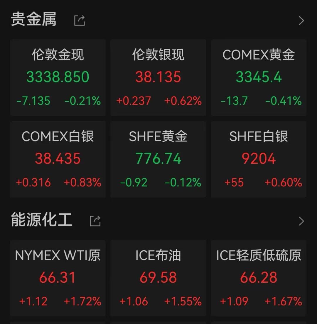 大宗商品方面,截至當(dāng)?shù)貢r間7月17日收盤,COMEX黃金期貨、倫敦金現(xiàn)貨分別下跌0.41%、0.21%,COMEX白銀期貨、倫敦銀現(xiàn)貨分別上漲0.83%、0.62%;NYMEX原油期貨主力合約、ICE布油期貨主力合約均漲超1%。