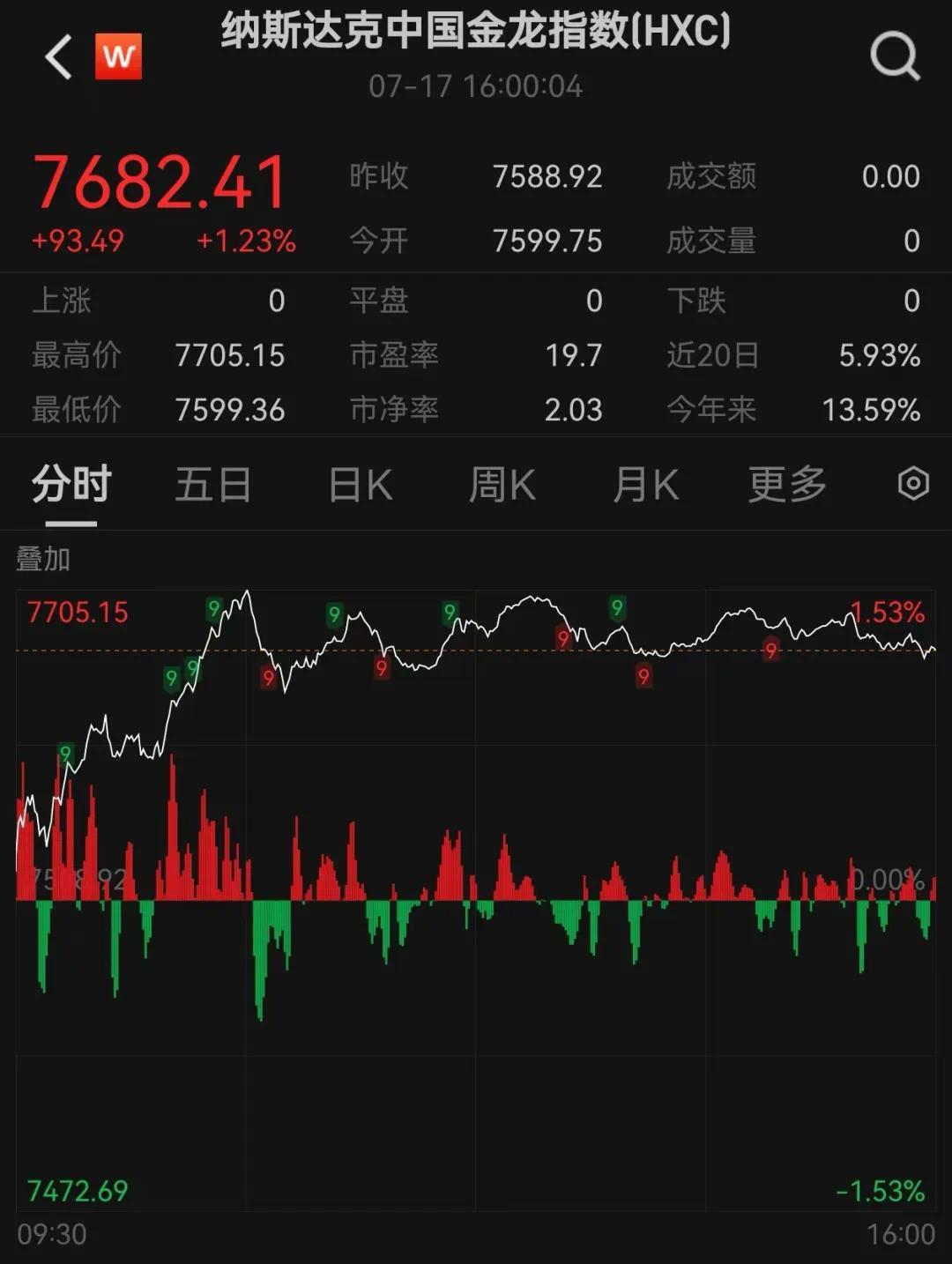據(jù)Wind數(shù)據(jù),截至當(dāng)?shù)貢r間7月17日收盤,納斯達(dá)克中國金龍指數(shù)漲1.23%,萬得中概科技龍頭指數(shù)漲0.79%。熱門中概股多數(shù)上漲,聯(lián)掌門戶漲超10%。